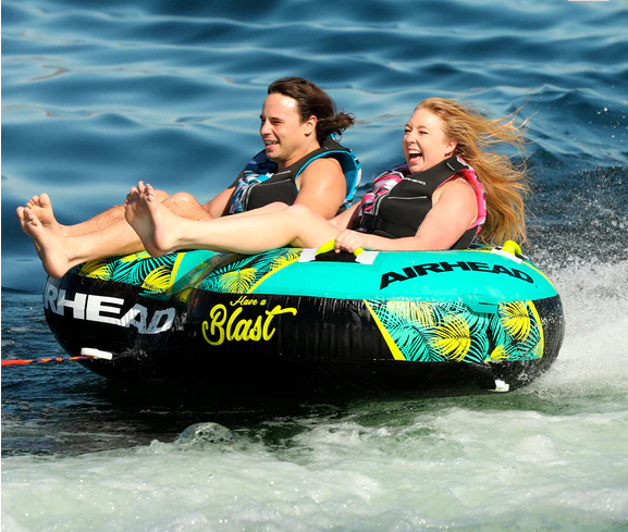 Few towable boat floats offer family fun like the Airhead Blast 2, our 2 person towable tube. Blast 2 boasts a red and teal tropical pattern, 8 neoprene comfort handles, and a self-draining floor that keeps riders upright no matter how much splashing happens.