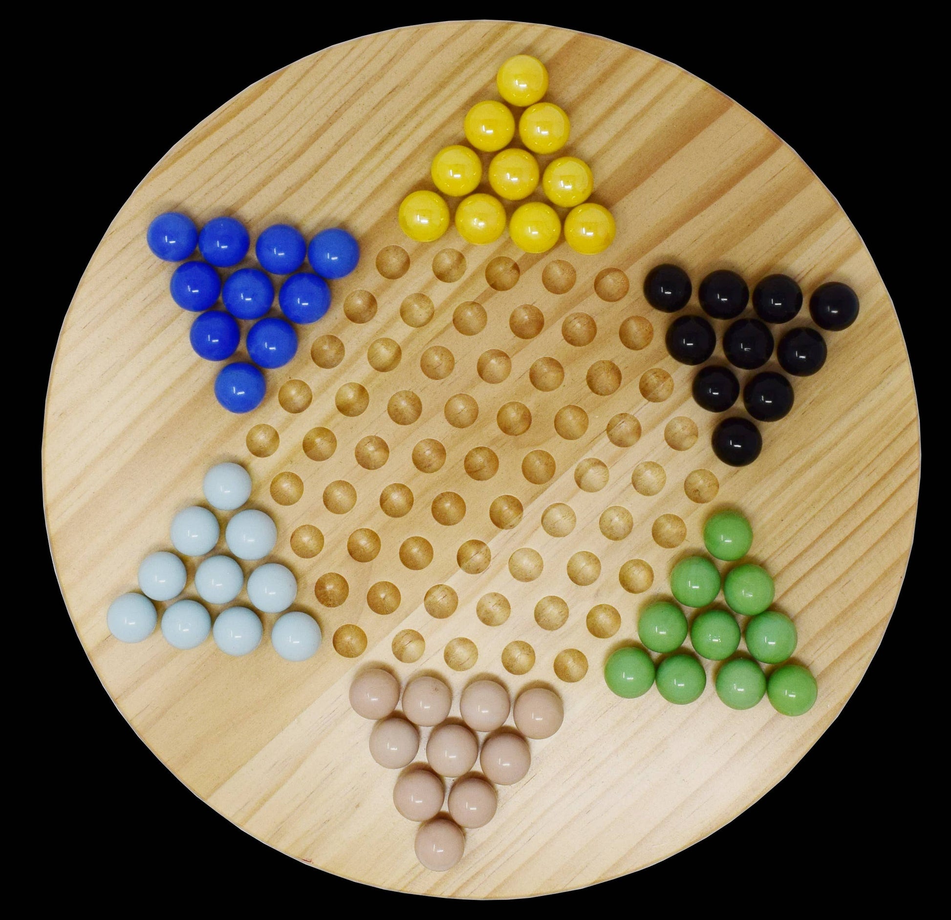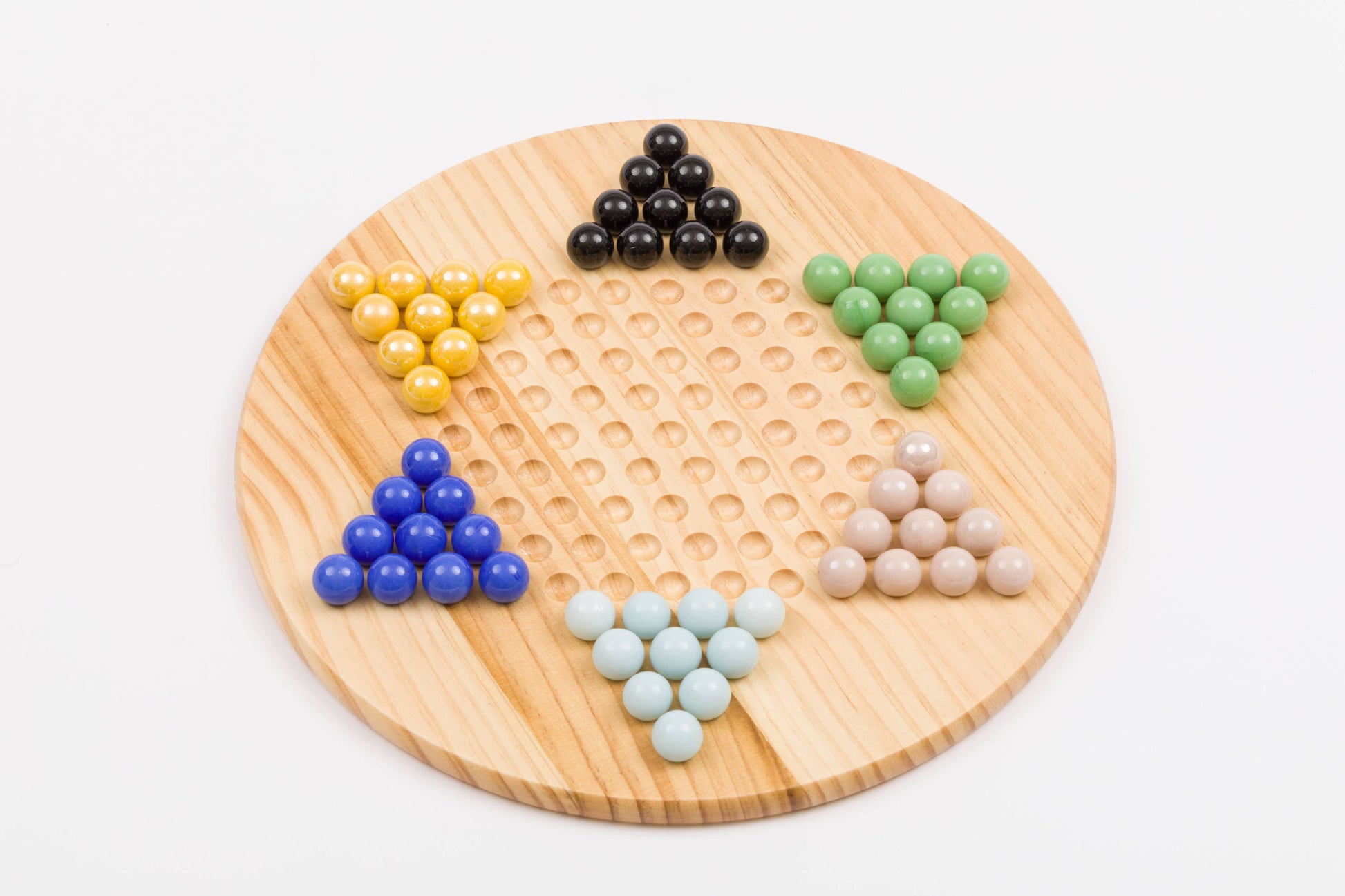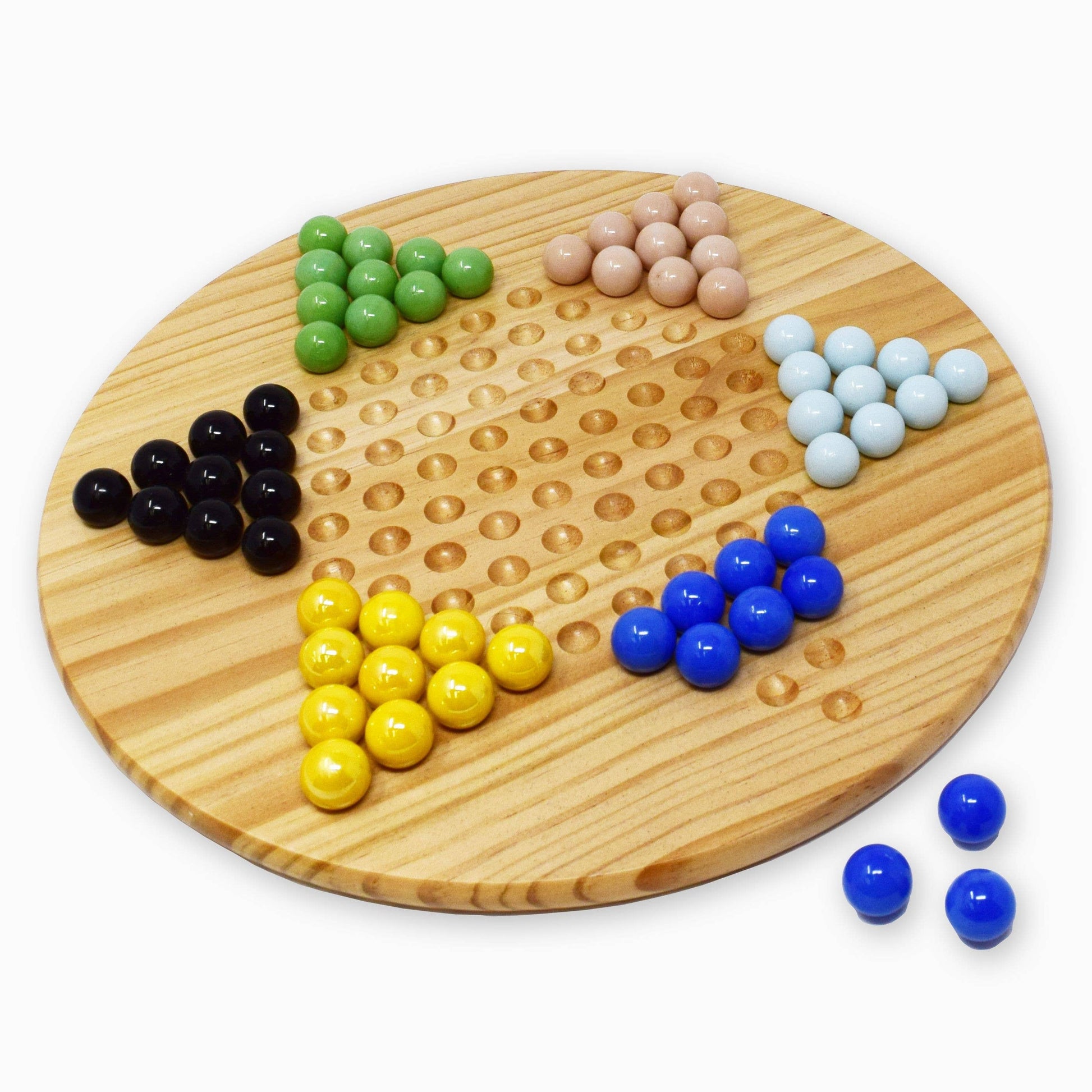 Regal Games Chinese Checkers includes an 11.5" traditional Chinese Checkers wooden game board and 60 glass marbles in 6 different colors. The Chinese checkerboard's solid natural wood construction and the colorful glass marbles are built to last generations. The marbles come in an assortment of bright colors like dark and light blue, yellow, pink, green, and black. This wooden Chinese checkerboard game set comes in a box for easy transportation and storage, no matter if you're playing at home or if you're taking it on the go to play with family and friends. This is a game that people of almost all ages can enjoy, making it a unique and entertaining gift for friends and family on many occasions. It’s the ideal gift for Birthdays, Christmas, New Year’s, Easter, Thanksgiving, Anniversaries, and any other occasion you have in mind. Ages 8+