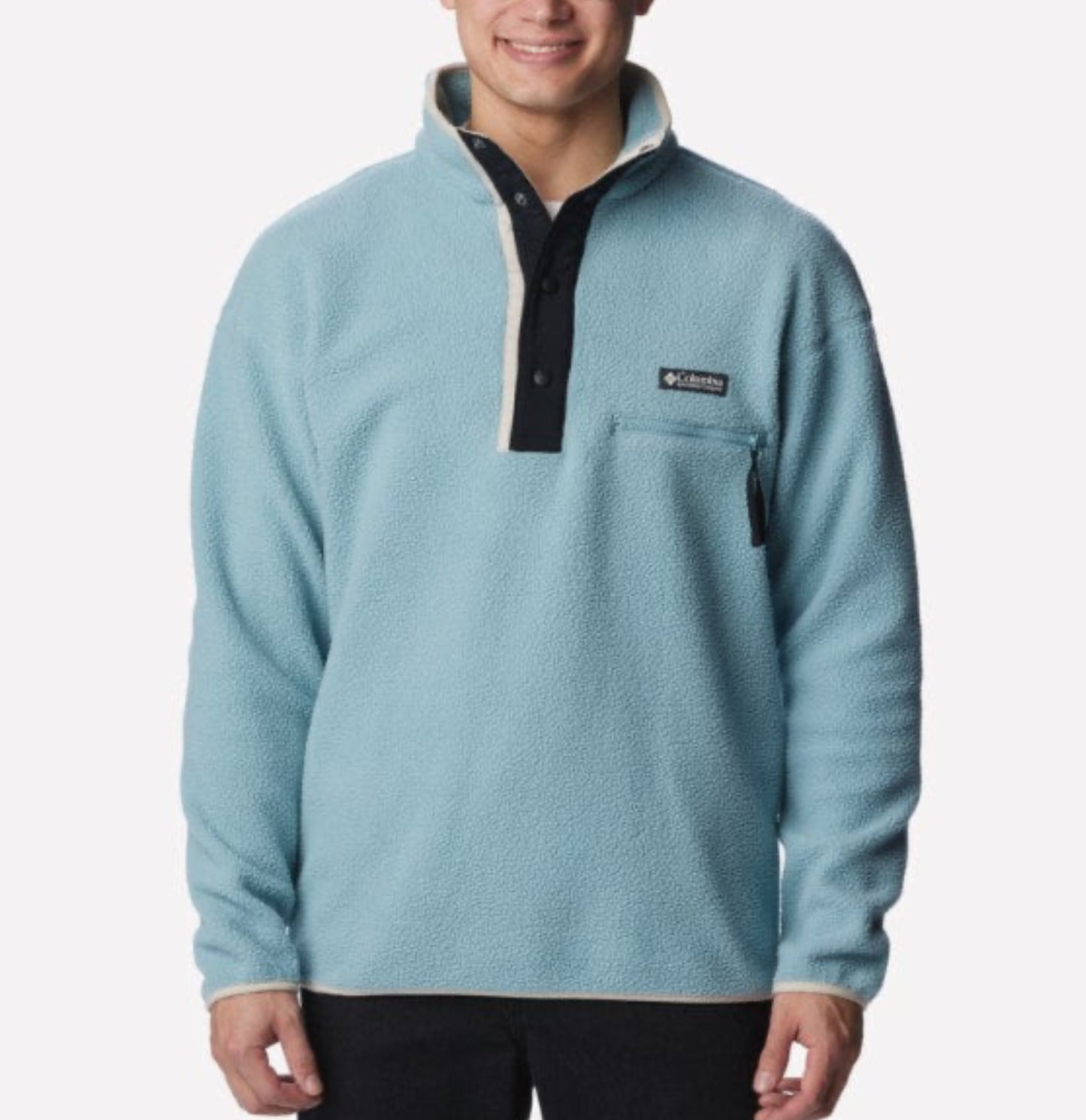 This cozy Sherpa pullover stands out as a functional mid-layer or sharp-looking outer layer on chilly fall days.