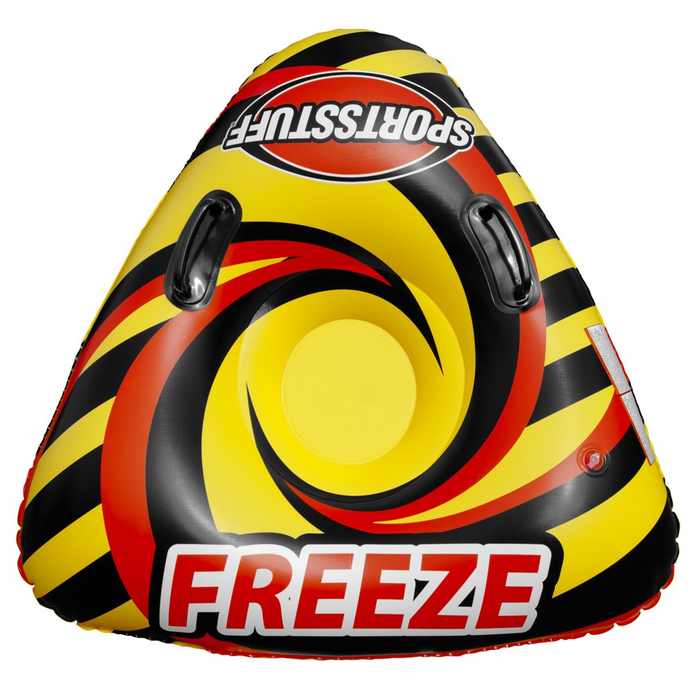 This single rider snow tube offers super performance and value. The classic triangle shape and hot graphics make this a kid pleaser. Literally glide down hills on a cushion of air. The heavy gauge PVC material has electronically welded seams and contains special crack resistant additives that protect the tube to ? 25 degrees C (-13 degrees F). Size: 39 in.