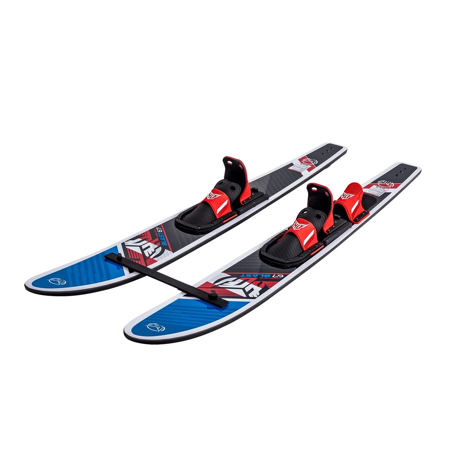The HO Blast Combo Waterskis are a great way to have fun with the whole family at the lake. Their wide width construction make for easy starts and help skier progress. Combined with a V-Bottom design, the Blast Combos are stable and fun. You can also learn to drop a ski and progress to slalom skiing, as they’re equipped with a rear toe strap. Waterskiing is a great way to have fun with the whole family at the lake. They feature tip inserts compatible with the HO Trainer bar that keeps ski tips together, making starting and learning easy.