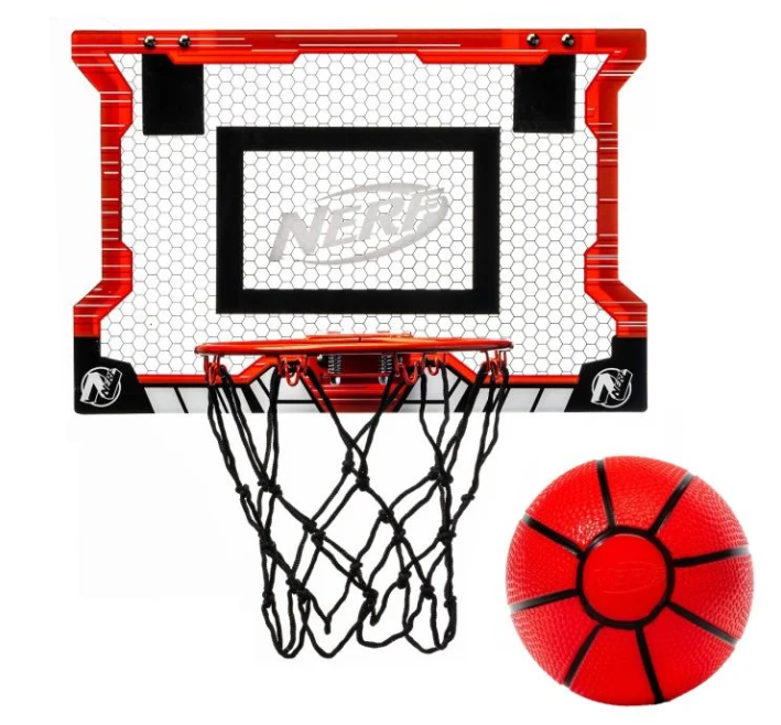The NERF Pro Hoop Basketball Set transforms any bedroom or living room into your own personal basketball court in no time! This premium quality over-the-door hoop fits on a standard sized door and assembles in seconds so you can get right into the action. The shatter-proof polycarbonate backboard and spring-loaded steel rim gives this hoop an authentic feel with premium performance to stand up to even the most ferocious dunks! Plus, this hoop includes a NERF mini basketball, so you have what you need to get the game started right out of the box. If you're ready to bring some high-quality hoops into your home, look no further, and grab your NERF Pro Hoops Basketball Set today!