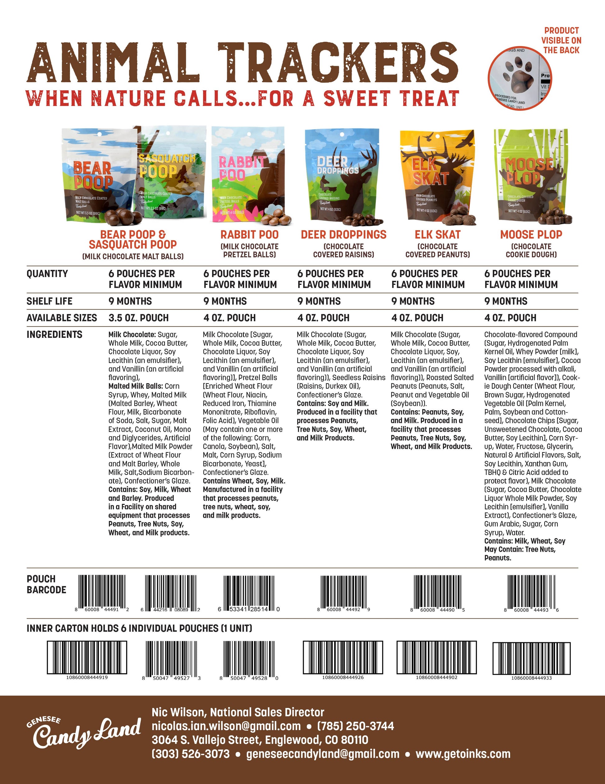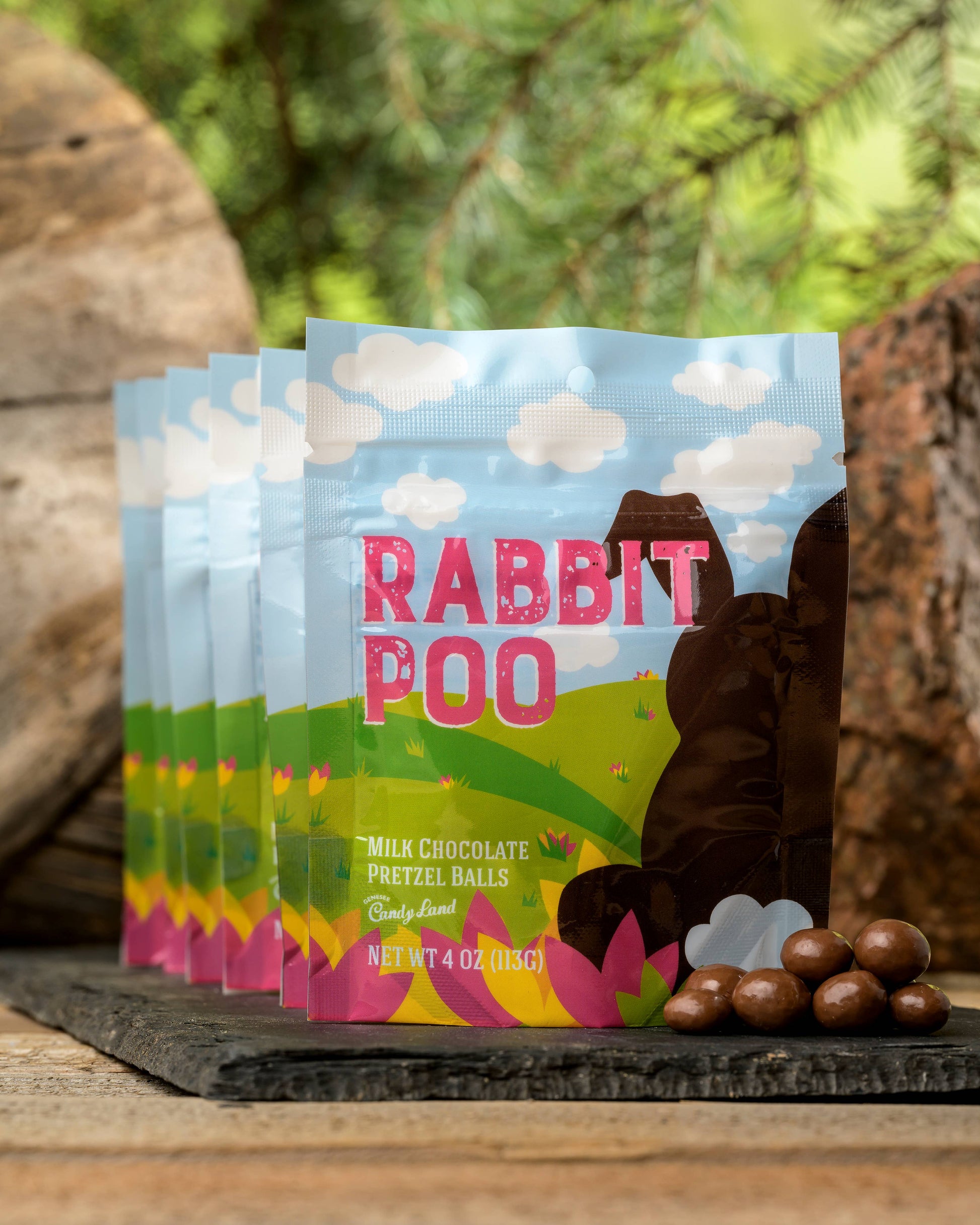 Rabbit Poo – milk chocolate pretzel balls in a 4 oz. stand up pouch. The packaging is really fun. On the back, there is a clear animal paw that shows the actual chocolate.