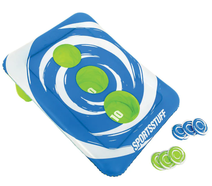Use on land or water! Includes one waterproof inflatable bean bag target and 6 waterproof bean bags (3 green, 3 blue). Inflated quickly with an SSV valve. 25x19in.