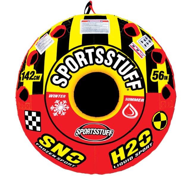 Take to the slopes or dominate the water with the new Super Crossover from Sportsstuff. This serious multipurpose tube for 1-2 riders features a heavy-duty partial nylon cover and slick durable PVC tarpaulin bottom to speed things up. The Speed Safety Valve makes inflation and deflation fast and easy while the double-webbing foam handles with knuckle guards make holding on simple and comfortable. Fly down your favorite sledding hill or use it on the lake as a towable for an entirely different experience. Choose your element, grab a friend, & take a ride on the Super Crossover to make the most of your winter or summer days.